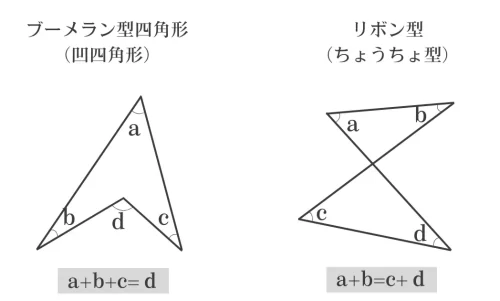 さらに応用問題を解くとき、下の図のブーメラン型四角形と、リボン型図形の角の和を求める方法が役に立ちます。(いずれも外角の定理で説明できますが、ここでは省略します。)