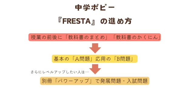 中学ポピーは5教科で教科書準拠なので、学校の授業に合わせた予習・復習が進められます。毎月届けられる教材「FRESTA」英数国は日々の予習・復習に使用、音声教材や解説動画のサポートもついています。理社はまとめ編と問題編に分かれ、ノート整理にも役立つ内容です。ハイレベルな問題に取り組みたい人向けの問題集「パワーアップ」も4月号または入会時にお届けしています。
