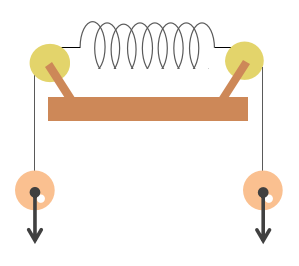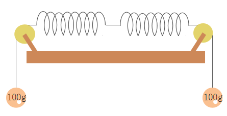 上の図のようにばねの両端に同じ重さのおもりをつけた場合、どのようにばねが伸びるのでしょうか。両端におもりをつけているので、