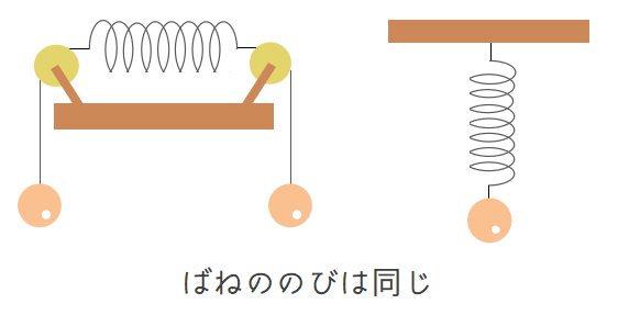ばねの両端に同じ重さのおもりをつけたとき、ばねの片側は壁や天井と同じ役割をしています。下の図のように、ばねの両端に同じ重さのおもりをつけたときは、片側におもりを1つつり下げたときと同じのびになります。