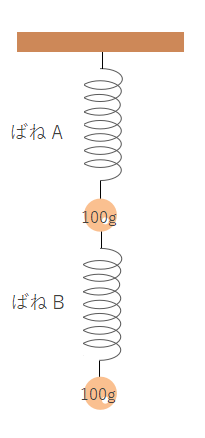 1Nの力で引くと1cm伸びるばねA、ばねBがあります。下の図のようにこれらのばねをつなげて100gのおもりを2つつるしたとき、ばねAとばねBののびはそれぞれ何㎝になるでしょうか。なお、このときばねの重さは考えないものとします。