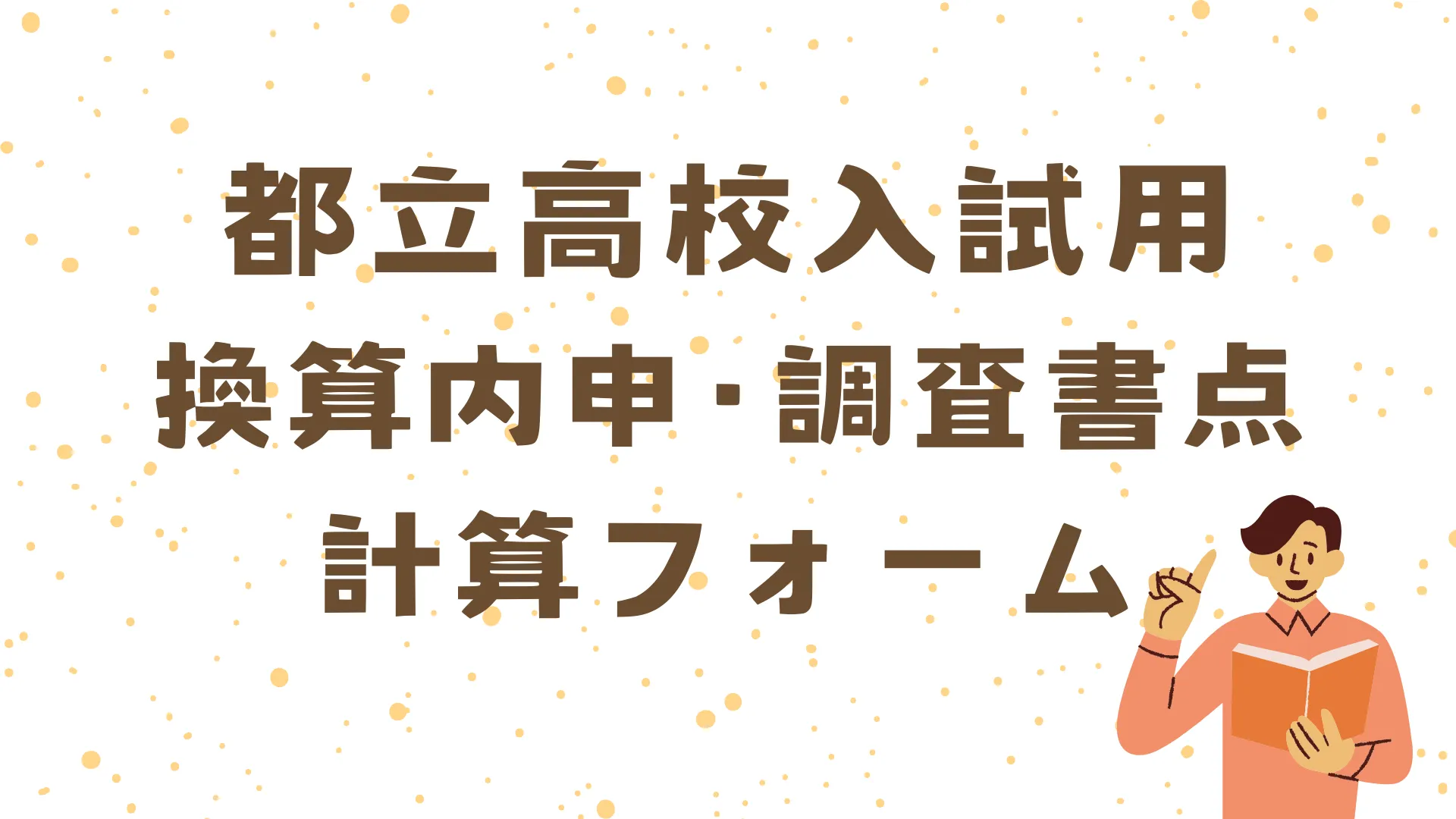都立高校入試の「学力検査に基づく入試」において利用される、換算内申と調査書点を求めるフォームを作成しました。調査書点は5教科入試で7:3の場合と3教科入試で6:4の場合で求められます。受験校にあわせて選んでください。(令和8年度入試の情報です。)